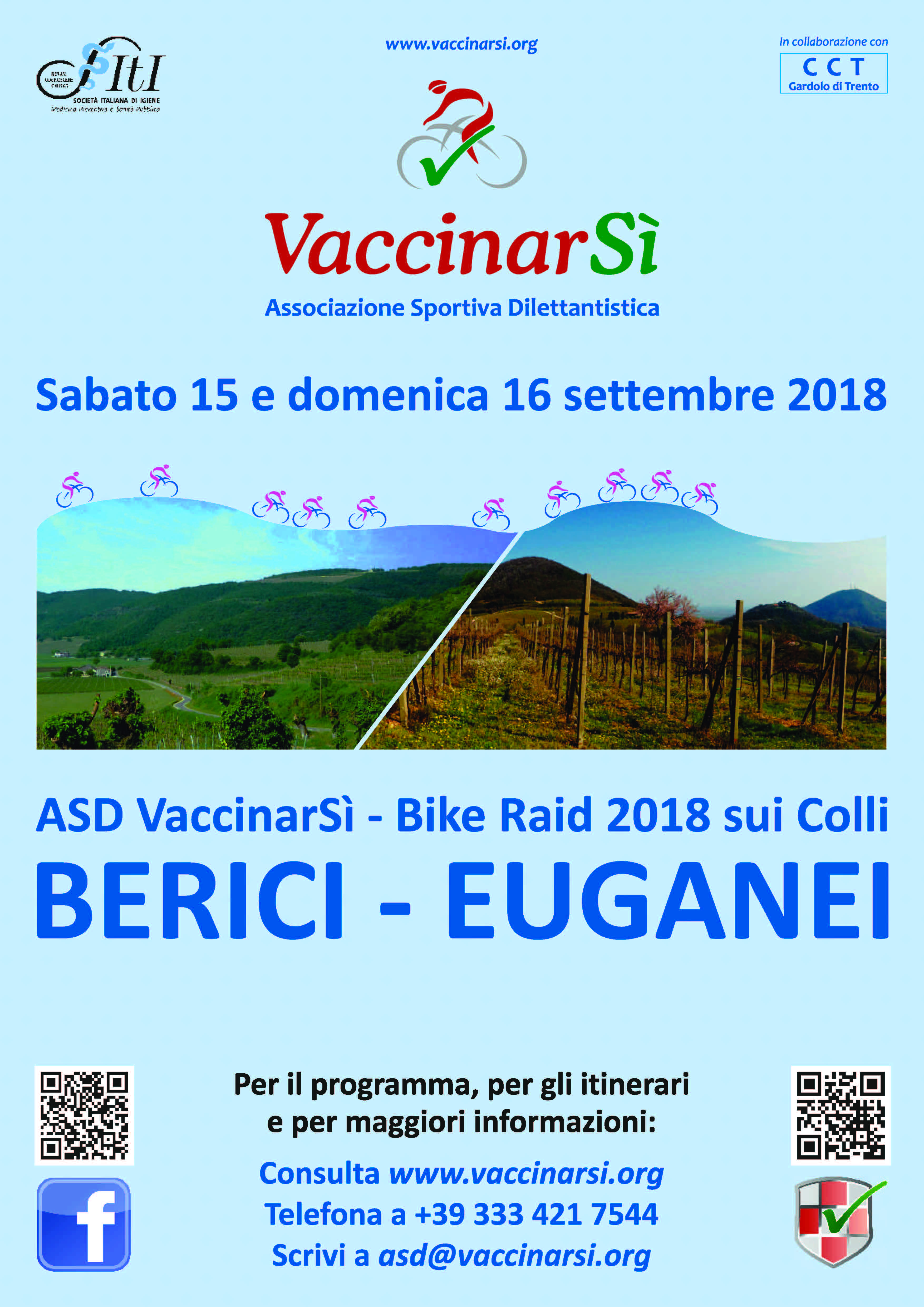 La promozione delle vaccinazioni viaggia sulle due ruote. L'Associazione Sportiva Dilettantistica ASD VaccinarSi, con il patrocinio della SItI - Società Italiana di Igiene e in collaborazione con il CCT Gardolo di Trento organizza per sabato 15 e domenica 16 settembre 2018 un Bike Raid 2018 sui Colli BERICI – EUGANEI.
